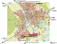 Eine grobe Übersicht über Hameln bietet Ihnen nebenstehende Karte mit den Hauptausfallstraßen.